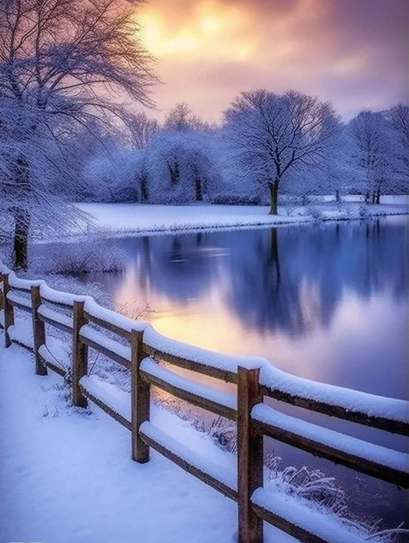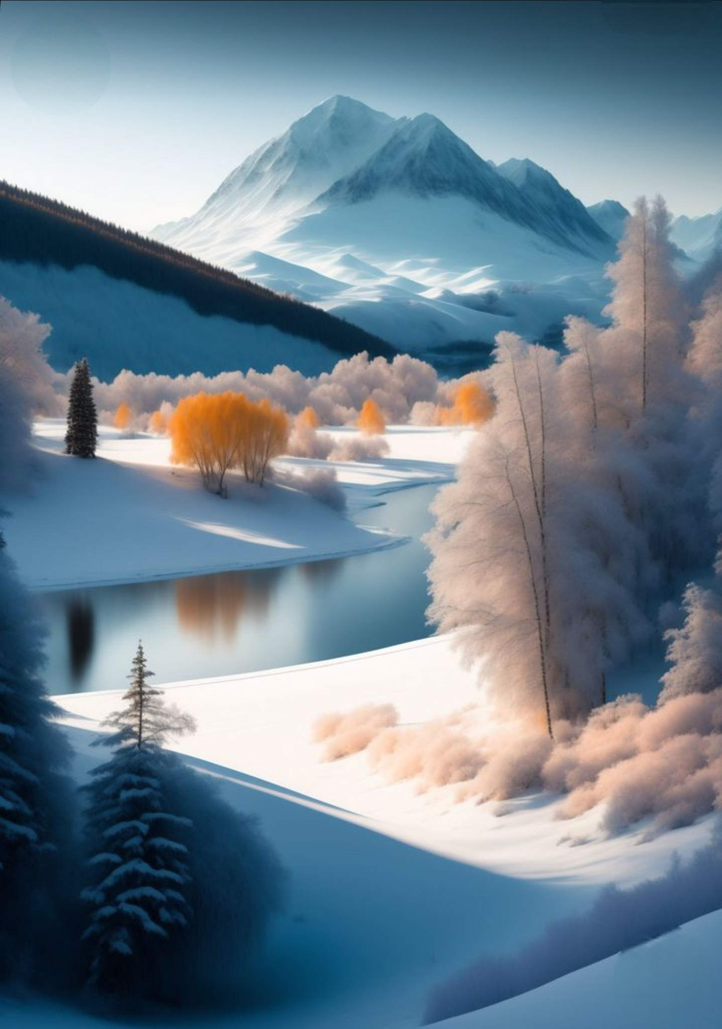 River, trees, snow